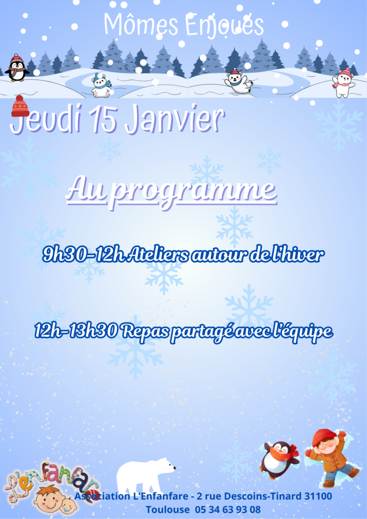 Des activités thématiques (lecture partagée, ateliers sensoriels, éveil musical…) sont encadrées par nos éducatrices de jeunes enfants, et un repas partagé clôture les Mômes enjoués.